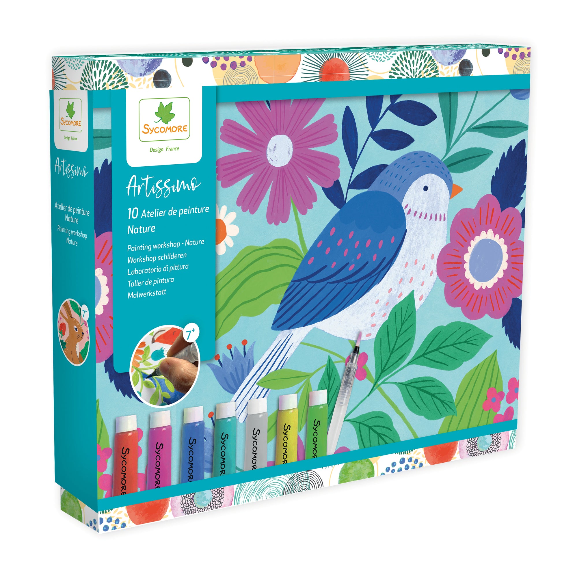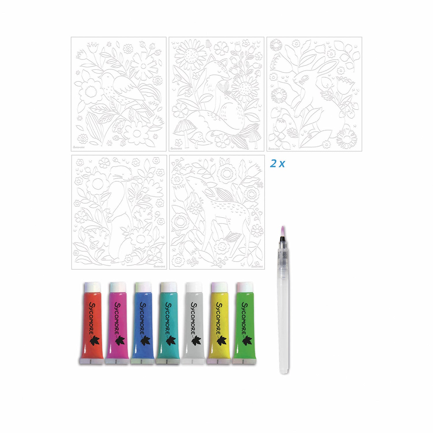 Deze set bevat 10 afbeeldingen, 7 kleuren verf en een kwast.