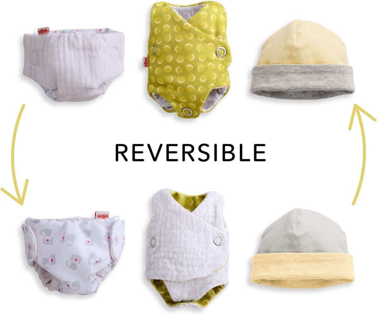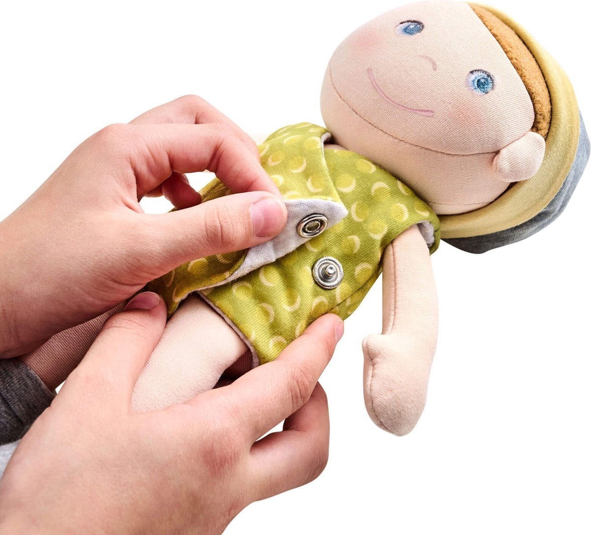Babypop Maxime is een volledig stoffen speelpop van 28 cm, speciaal ontworpen voor jonge kinderen die graag verzorgen. Maxime voelt zacht aan en is ideaal als eerste pop. De pop is inclusief romper, luier, mutsje, slofjes, slabbetje en speen. De kleding is dubbelzijdig waardoor het net lijkt alsof de babypop echt verschoond is. De magnetische speen blijft aan het mondje vastzitten.