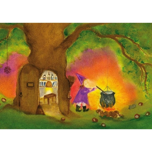 Ansichtkaart oliepastel heks met ketel van Baukje Exler.