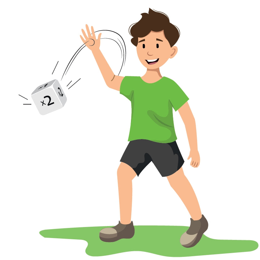 - Als jouw 6 bijvoorbeeld het dichtst bij de vermenigvuldigingsdobbelsteen ligt waarop 'x 2' staat, krijg je 6 x 2 = 12 punten.