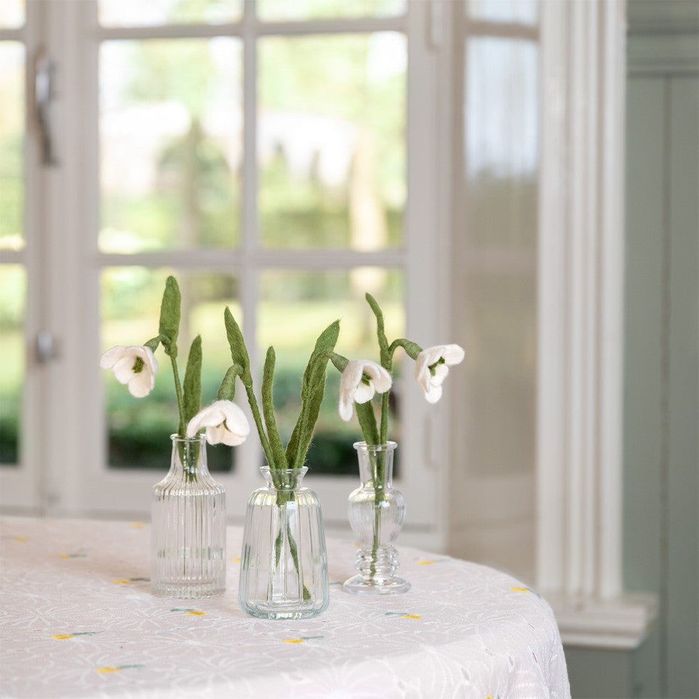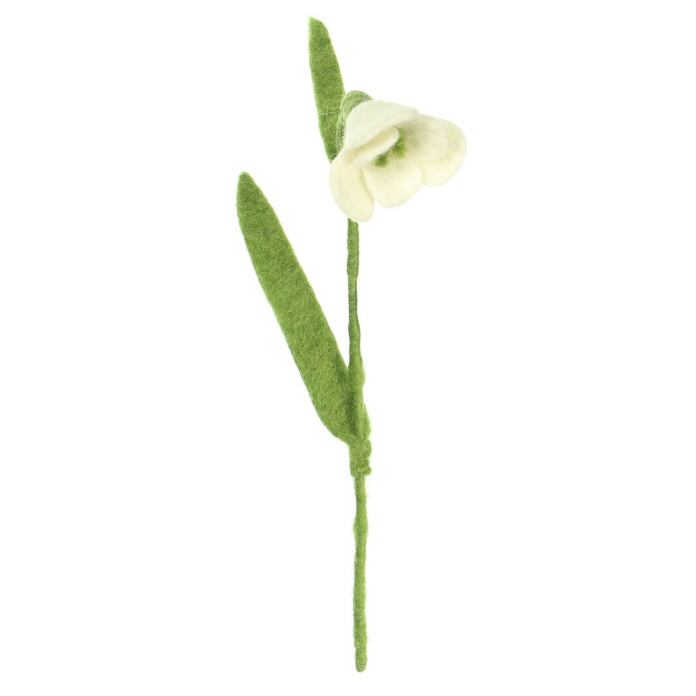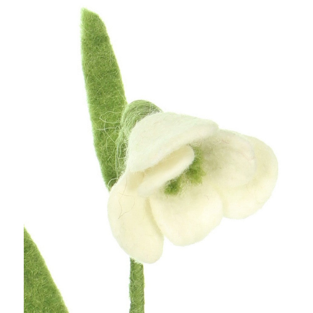 Sneeuwklokje van het delicate merino-wolvilt. In de stengel is metaaldraad verwerkt zodat de bloem in vorm gebogen kan worden indien gewenst. Erg leuk in een vaasje.