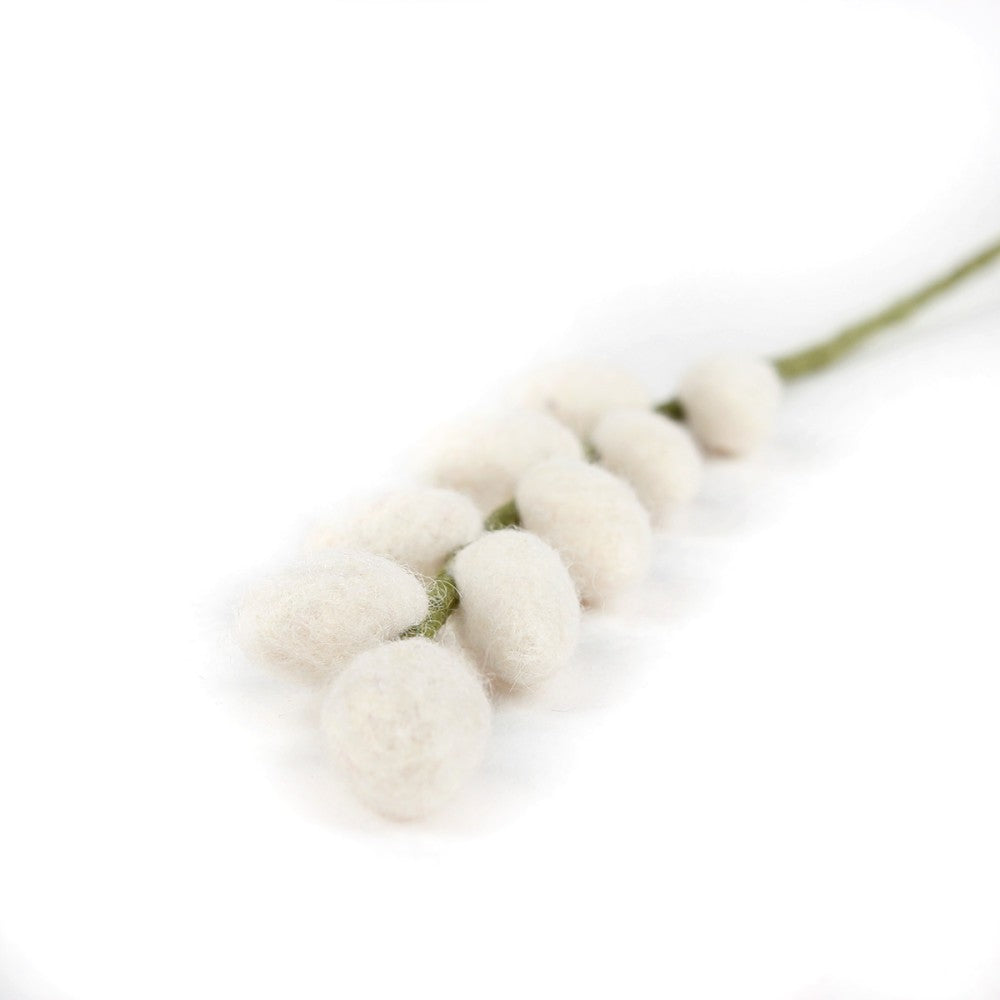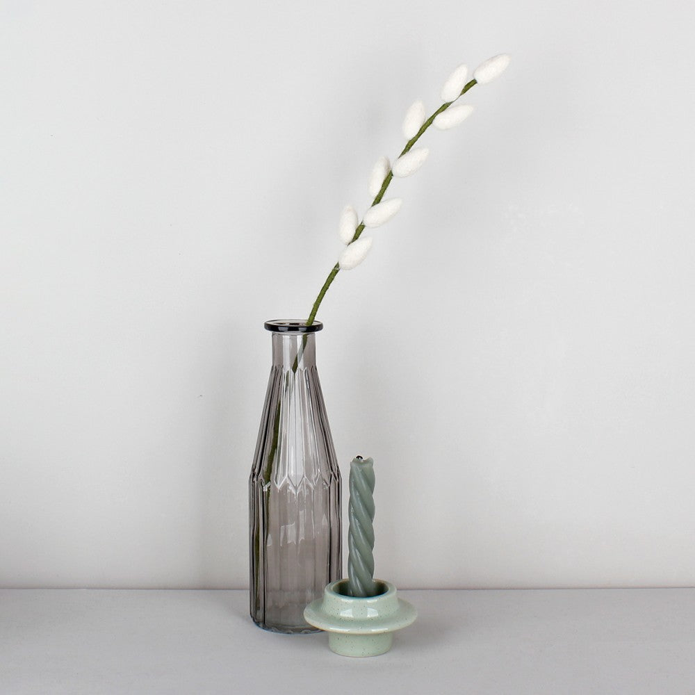Tak katje van vilt. In de stengel is metaaldraad verwerkt zodat de tak in vorm gebogen kan worden indien gewenst. Erg leuk in een vaas!