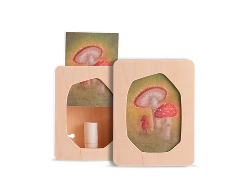 Dit handgemaakte kaartlampje met afgehoekte vorm is ontworpen om er eenvoudig een A6-kaart of foto in te schuiven. Wanneer het lampje brandt geeft dit een prachtig verlichtend beeld van de kaart of foto. Je schuift de gewenste afbeelding er gemakkelijk in- en uit en kunt er daardoor eindeloos mee variëren. Het is een wandlampje dat zeer geschikt is als nachtlampje. Maar ook als sfeerlicht in de woonkamer, bij de seizoenstafel of op de gang komt hij goed tot zijn recht.