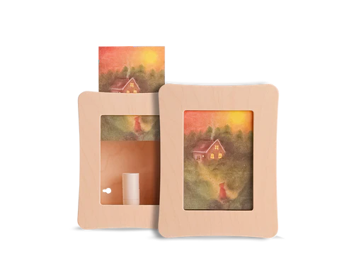 Dit handgemaakte kaartlampje in naturel uitvoering is ontworpen om er eenvoudig een A6-kaart of foto in te schuiven. Wanneer het lampje brandt geeft dit een prachtig verlichtend beeld van de kaart of foto. Je schuift de gewenste afbeelding er gemakkelijk in- en uit en kunt er daardoor eindeloos mee variëren. Het is een wandlampje dat zeer geschikt is als nachtlampje. Maar ook als sfeerlicht in de woonkamer, bij de seizoenstafel of op de gang komt hij goed tot zijn recht.