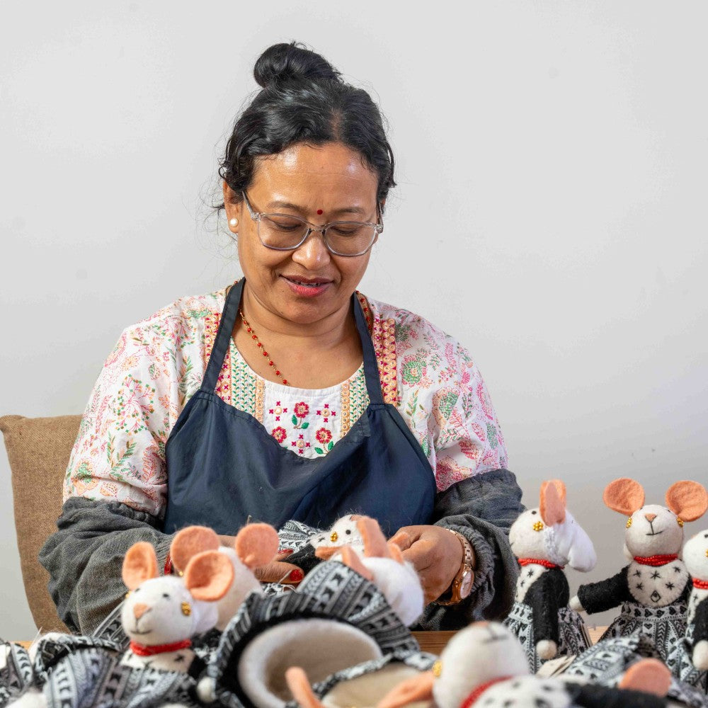 Zeeuws muisje van vilt in traditioneel kostuum. De prachtige details zoals het kralensnoer (in de echte klederdracht zijn dit bloedkoralen), kanten mutsje en zwartwit zeeuws schortenbont geven haar een unieke uitstraling. Een ode aan Zeeland, perfect als decoratief cadeau of verzamelitem.