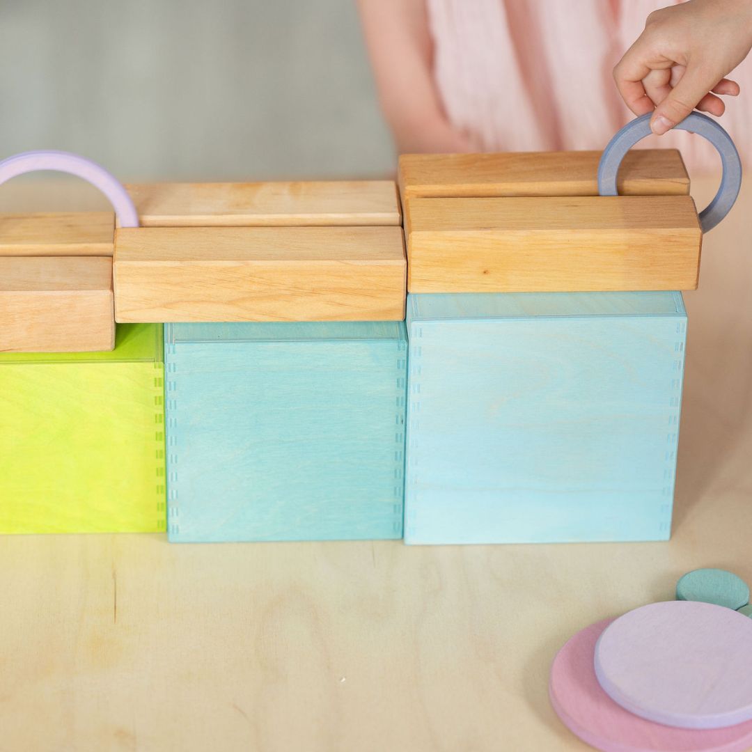 Tien cirkels en tien ringen in verschillende formaten en kleuren waar leuk mee gespeeld en gebouwd kan worden. Denk aan gebouwen, balans spelletjes en platforms creëren.