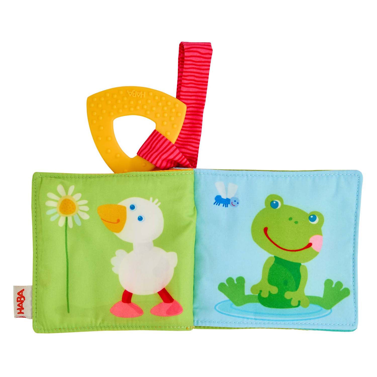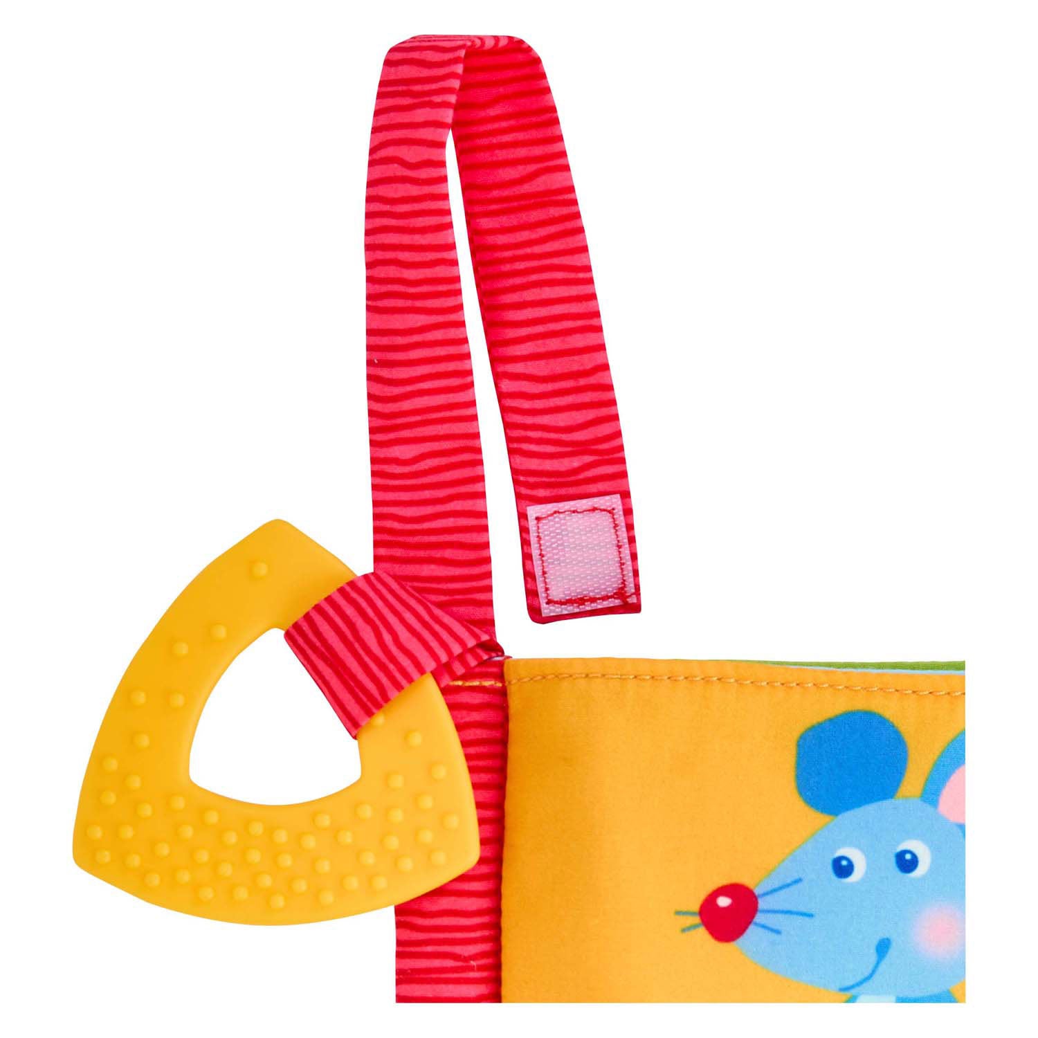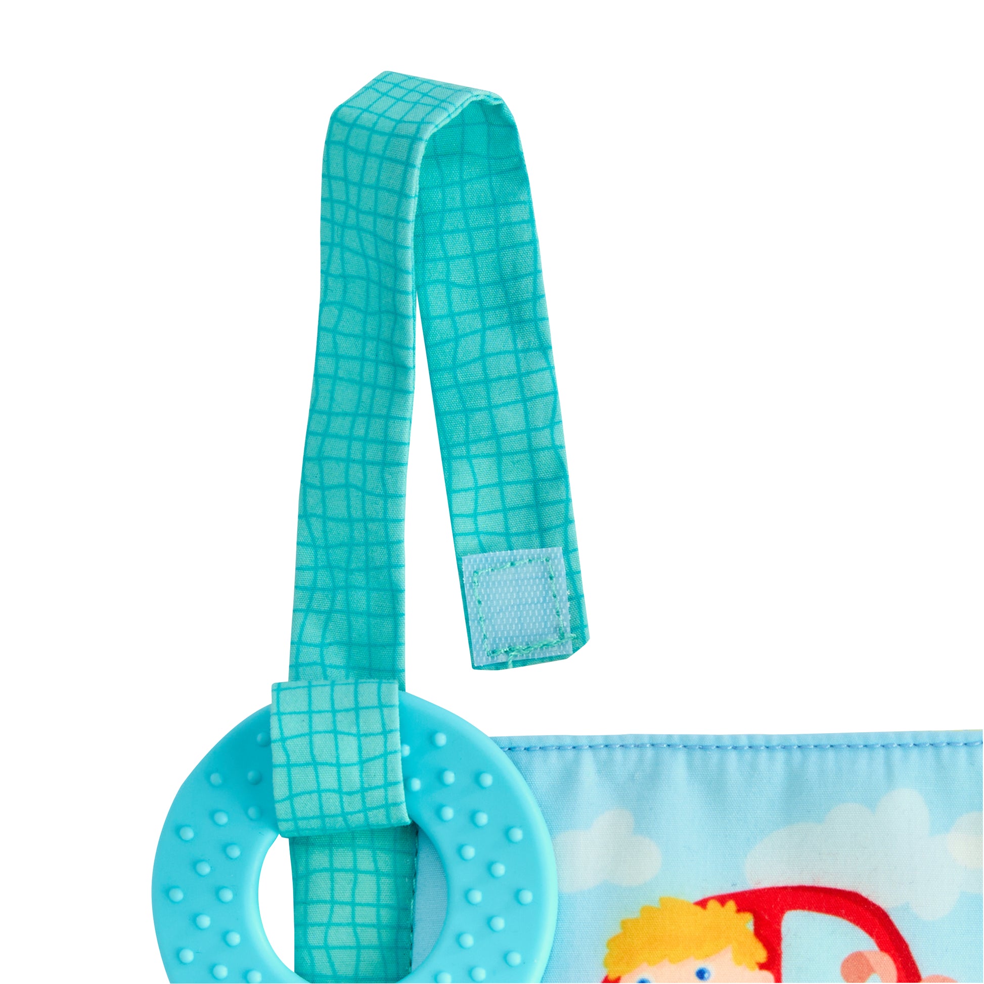 Buggyboekje met een knisper, pieper, bijtspeeltje en een lusje met klittenband om het boekje ergens aan vast te maken.