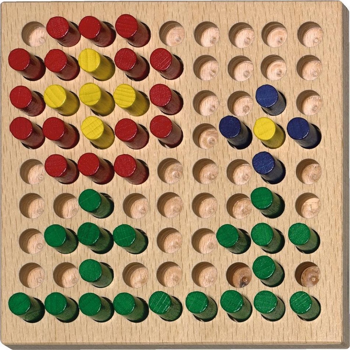 Inhoud: 25 pinnen per kleur (rood, geel, blauw en groen) en 1 blank gelakt pinnen-plankje (12 x 12)