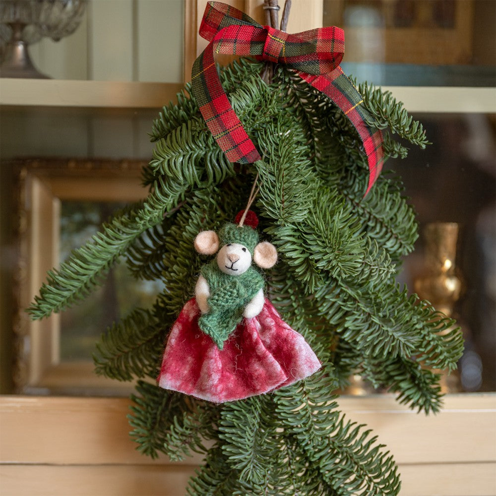 Hanger van een muis uit de serie Notenkraker, Oma in de kleur rood. Voorzien van touwtje om ergens aan te hangen. Leuk in de kerstboom!