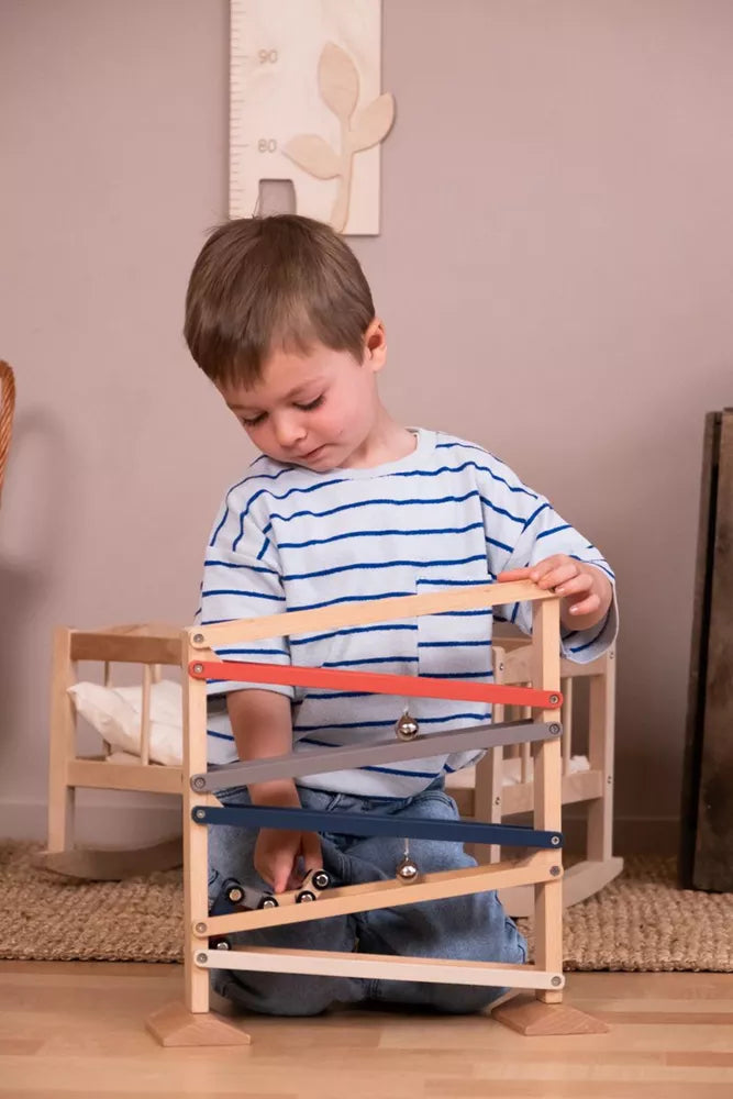 Houten autobaan met bel