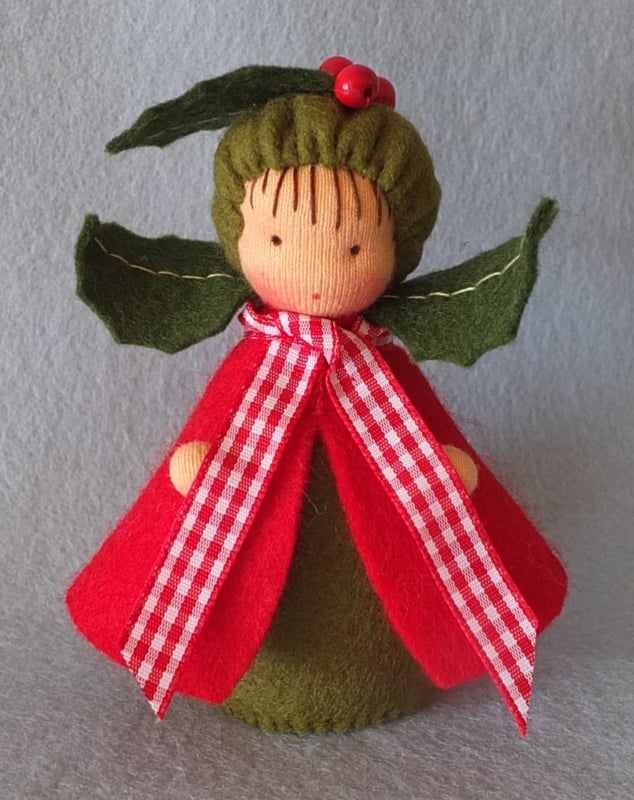 Een eenvoudig hulstvrouwtje met rode besjes op haar muts en een geruit strikje om.