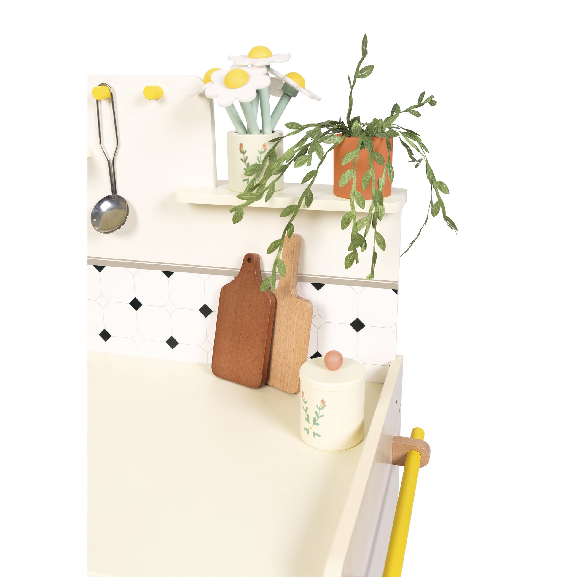 Deze grote keuken heeft alles wat je nodig hebt om een heerlijk diner te bereiden: 1 koekenpan en 1 kookpan met deksels, 1 lepel, 1 schuimspaan, 2 snijplanken, 1 zoutvaatje, 1 pepermolen, 2 kruidenpotjes, 1 vaas met 5 bloemen, 1 groene plant en twee grote manden om al het keukengerei in op te bergen. Je kunt gerechten grillen of laten sudderen op de kookplaten en de temperatuur regelen met de draaiknoppen met geluid die naast de kookplaten zijn aangebracht. Voor de lekkerbekken is de keuken uitgerust met twee ovens, zodat je vlees in de ene oven kunt grillen en een taart in de andere kunt bakken! Na het koken is het tijd voor de afwas, gelukkig is er een grote gootsteen en een kraan met draaiknoppen om de temperatuur te regelen!