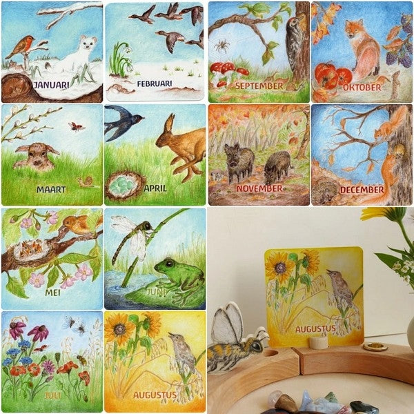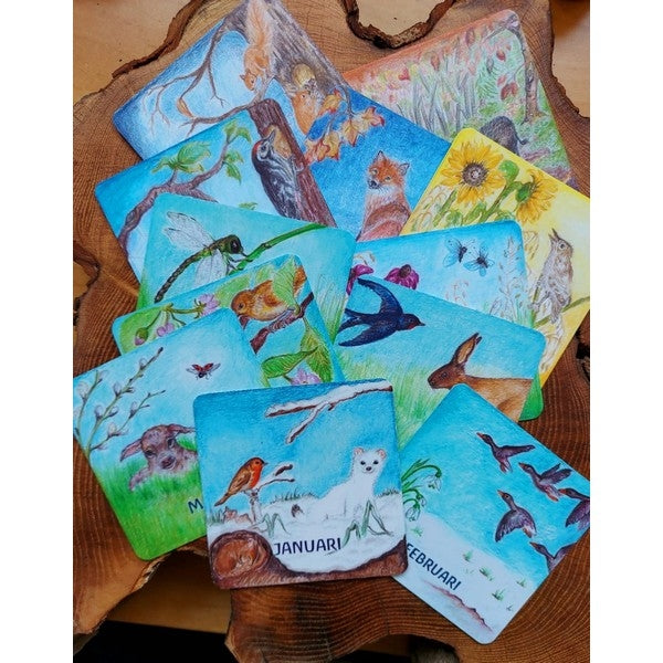 Kaartenset maanden van het jaar (12 stuks). De kaartjes hebben een afmeting van 9 x 9 cm.