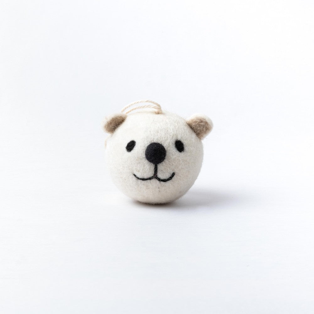 Een vilten kerstbal met het gezicht van een ijsbeer. Ook verkrijgbaar als pinguïn en rendier. Erg leuk voor in de kerstboom! Ideaal voor een huishouden met kinderen en/of dieren, deze kerstballen kunnen namelijk niet kapot vallen!