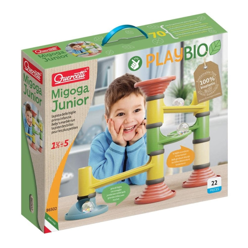 De Quercetti Play Bio-lijn wordt gemaakt van biocomposiet, afkomstig van houten vezels en een speciale kunststof. De houten vezels komen uit Noorse bossen, correct gecertificeerd en milieuvriendelijk. Met de Play Bio-lijn wil Quercetti bijdragen aan het verminderen van de CO2-uitstoot en de toekomst van kinderen helpen beschermen.