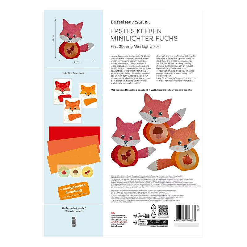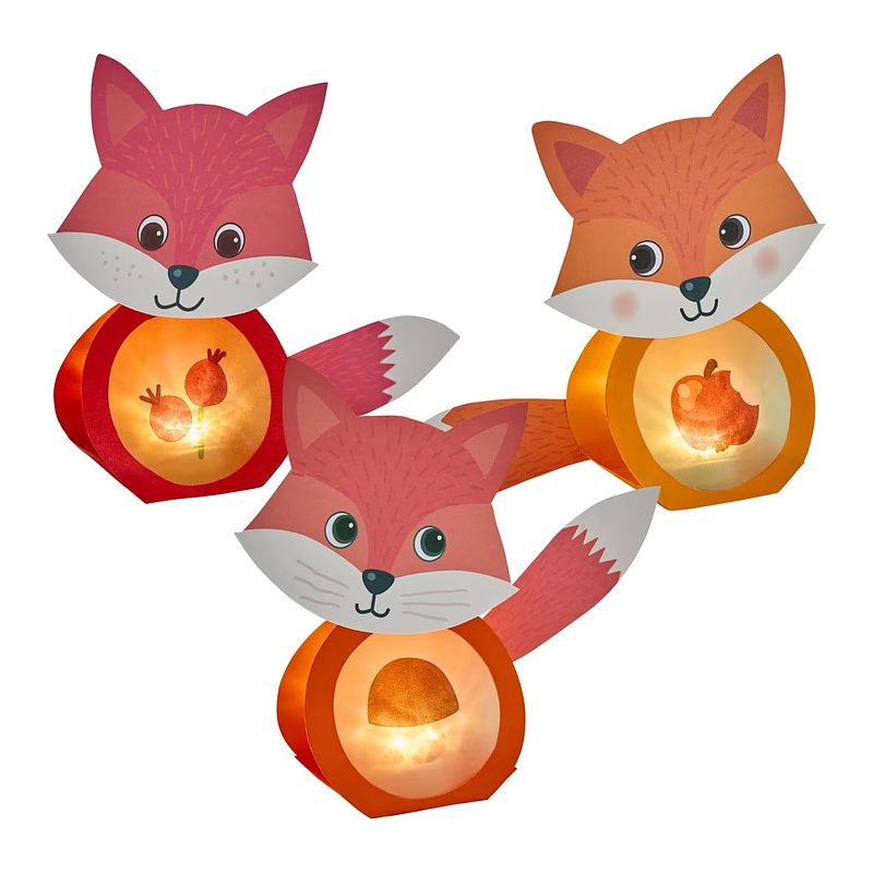 Met deze knutselset kunnen kinderen hun eigen vossen lampjes maken. De voorgesneden stukjes karton worden eenvoudig verwijderd en met calqueerpapier aan elkaar geplakt. Ideaal voor de eerste lijmoefeningen. Met een led-waxinelichtje creëer je een magische herfstdecoratie voor de kinderkamer of het raam.