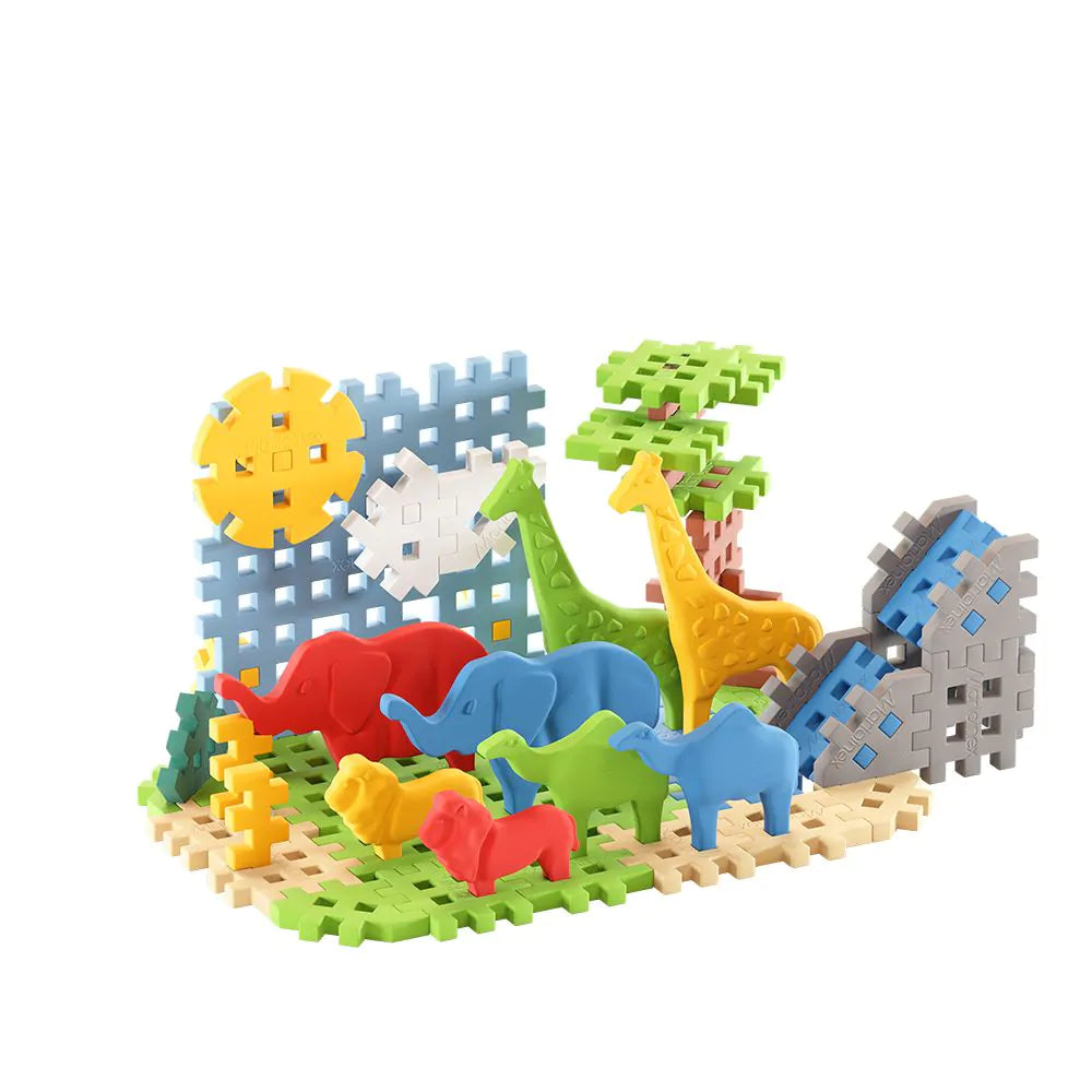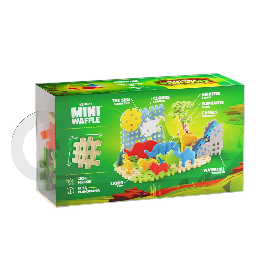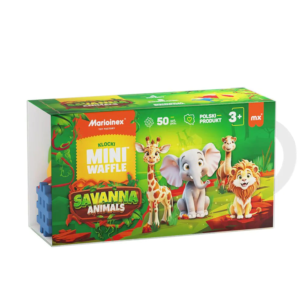 Laat kinderen vanaf 3 jaar de Afrikaanse savanne ontdekken met de Animals - Savanna 50 van Marioinex! Deze compacte bouwset bevat 50 flexibele Mini Waffle blokken, waarmee kinderen hun eigen kleurrijke natuurwereld bouwen.