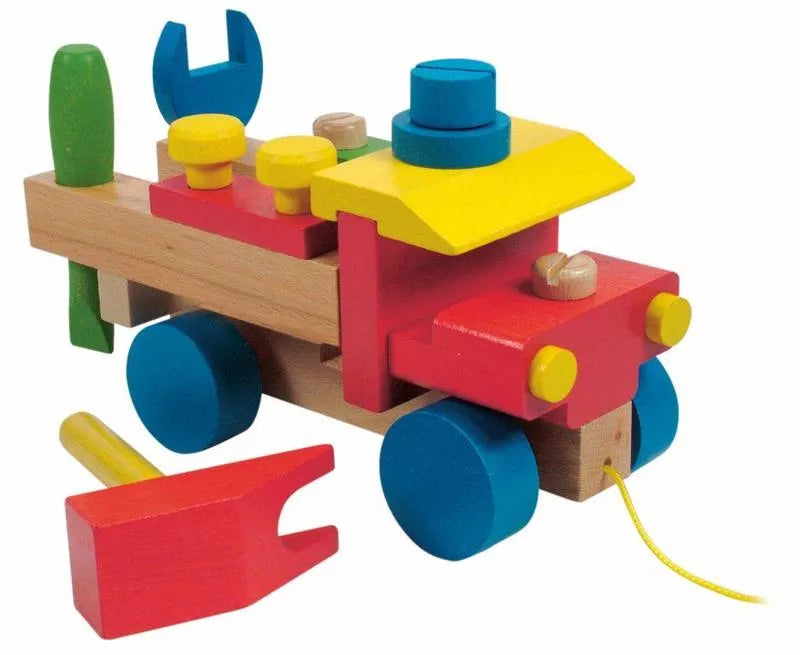 Een klusauto van hout. Voorzien van al het gereedschap dat nodig is om elke klus te klaren. Daarnaast kan de kleine natuurlijk ook aan de auto zelf klussen.
