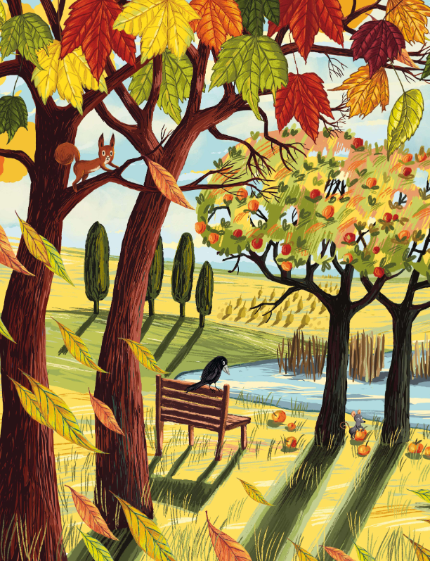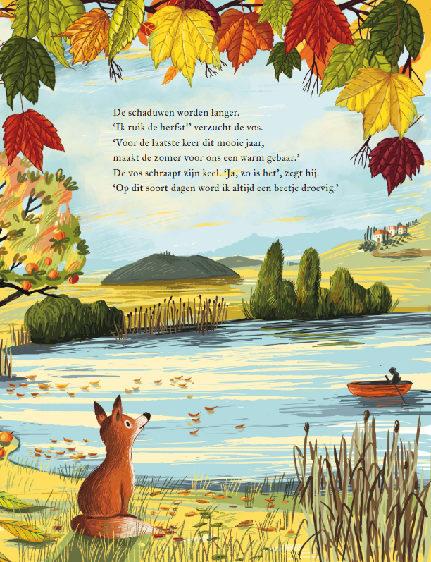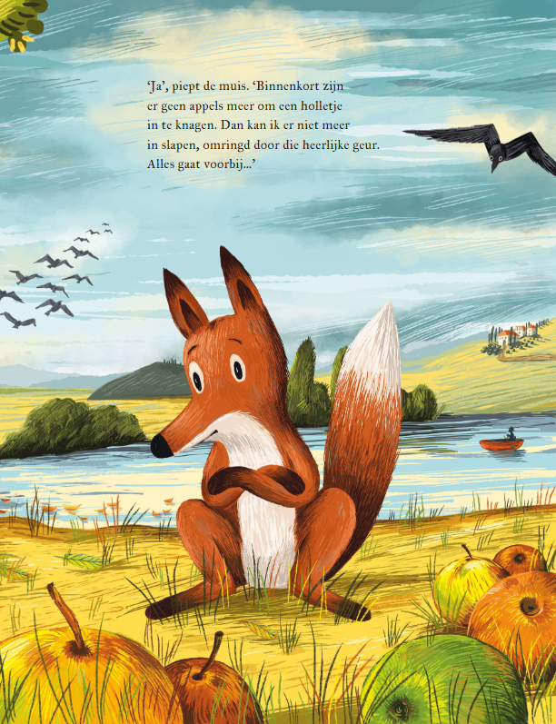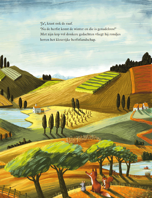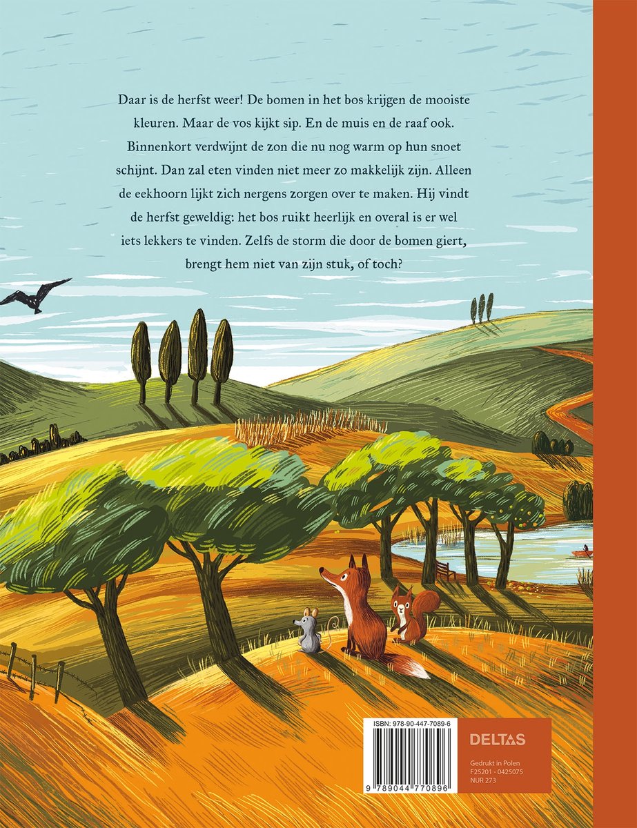 Daar is de herfst weer! De bomen in het bos krijgen de mooiste kleuren. Maar de vos kijkt sip. En de muis en de raaf ook. Binnenkort verdwijnt de zon die nu nog warm op hun snoet schijnt. Dan zal eten vinden niet meer zo makkelijk zijn. Alleen de eekhoorn lijkt zich nergens zorgen over te maken. Hij vindt de herfst geweldig: het bos ruikt heerlijk en overal is er wel iets lekkers te vinden. Zelfs de storm die door de bomen giert, brengt hem niet van zijn stuk, of toch?