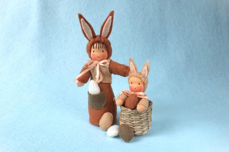 Naast hem zit een hazenkindje van 8 cm in een rieten mandje. Het kindje heeft ook een strikje en snoept van de paaseitjes.