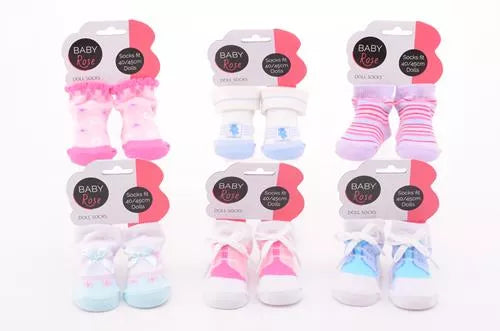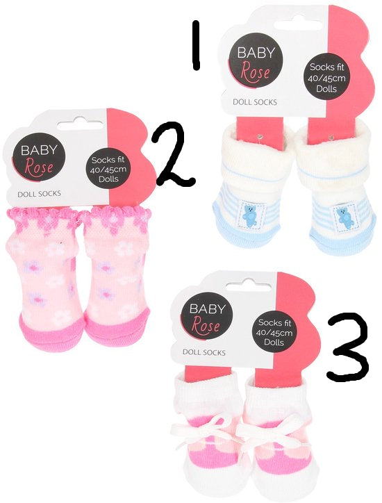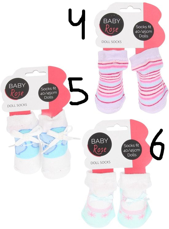 1 paar poppensokken. De sokken zijn geschikt voor poppen met een maximale lengte van 40/45 cm.