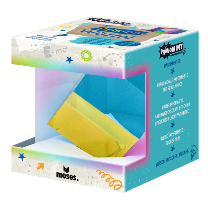 Met behulp van de fantastische prisma kubus kunnen verschillende kleurencombinaties gemakkelijk en speels worden ontdekt. Afhankelijk hoe de kubus wordt gedraaid en tegen het licht wordt gehouden komen nieuwe kleuren tevoorschijn. Inclusief informatie over het wetenschappelijk fenomeen van kleurenmenging. Draai bijv. de dobbelsteen en cyaan, magenta en geel veranderen in andere kleuren!