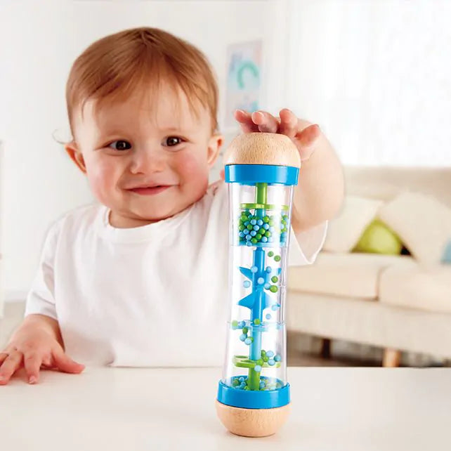 Draai deze regenmaker om en stimuleer de zintuigen met de langzaam rollende kralen en de zachte regendruppelgeluiden. Perfect ontworpen vorm voor een eenvoudige hantering door de peuter.