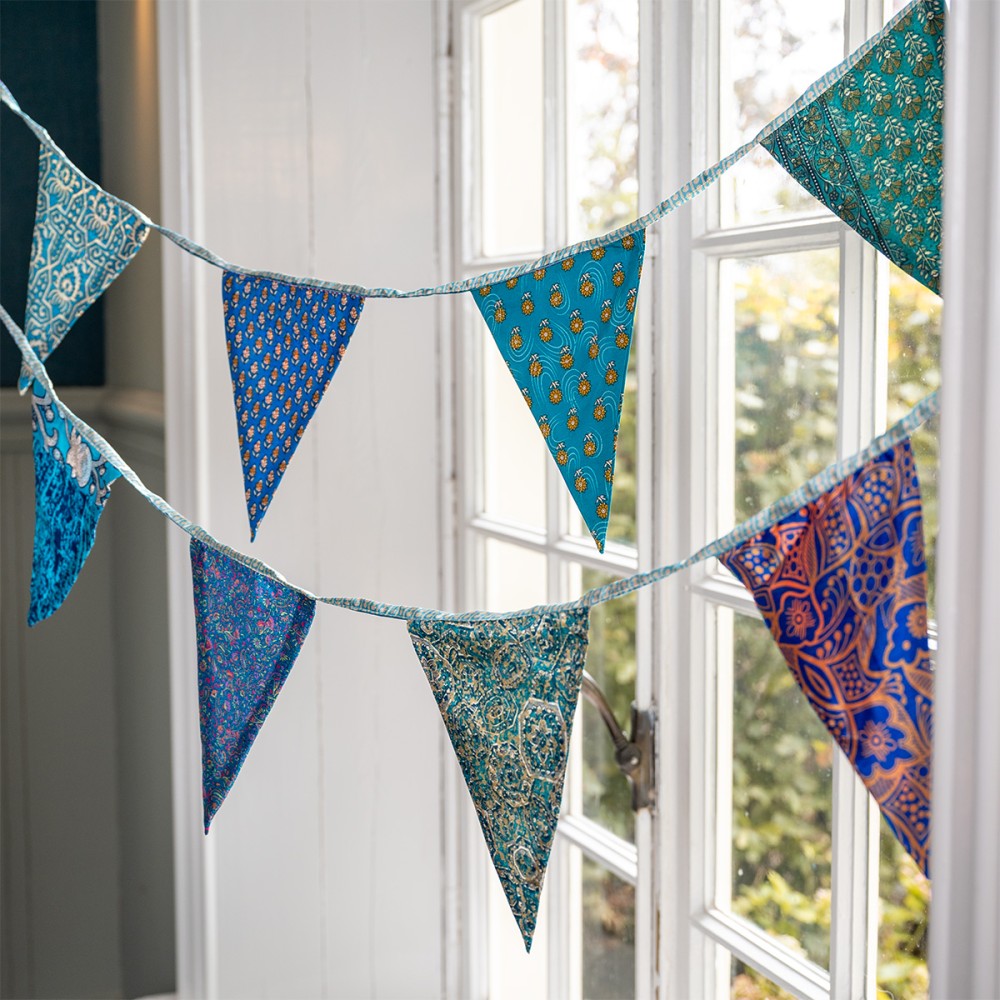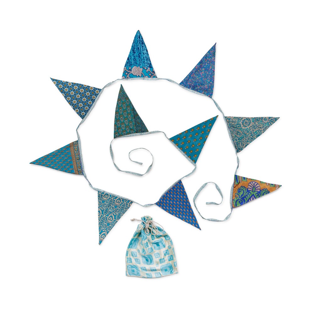 Slinger met vlaggetjes gemaakt van gerecyclede sari (een traditioneel kledingstuk dat door vrouwen wordt gedragen in Nepal) in turquoisetinten. De slinger is verpakt in een mooi bijpassend zakje van hetzelfde materiaal. Heel leuk voor een verjaardag, maar ook als decoratie in elk interieur of tuin! Let op: omdat het om gerecyclede materialen gaat, kunnen de kleuren en dessins afwijken van die op de foto. Alle slingers zijn uniek! De totale afmeting van de vlaggenlijn is 370 cm.