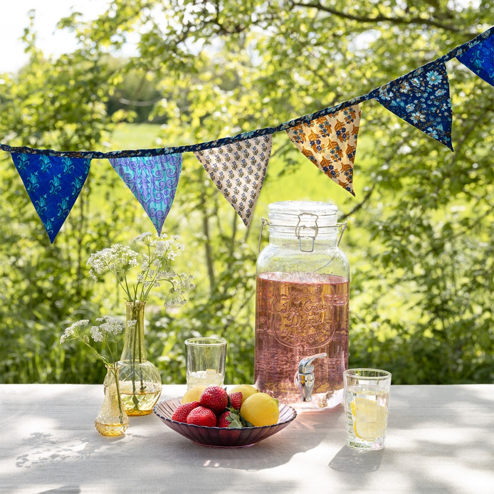 Slinger met vlaggetjes gemaakt van gerecyclede sari (een traditioneel kledingstuk dat door vrouwen wordt gedragen in Nepal) in blauwtinten. De slinger is verpakt in een mooi bijpassend zakje van hetzelfde materiaal. Heel leuk voor een verjaardag, maar ook als decoratie in elk interieur of tuin! Let op: omdat het om gerecyclede materialen gaat, kunnen de kleuren en dessins afwijken van die op de foto. Alle slingers zijn uniek!