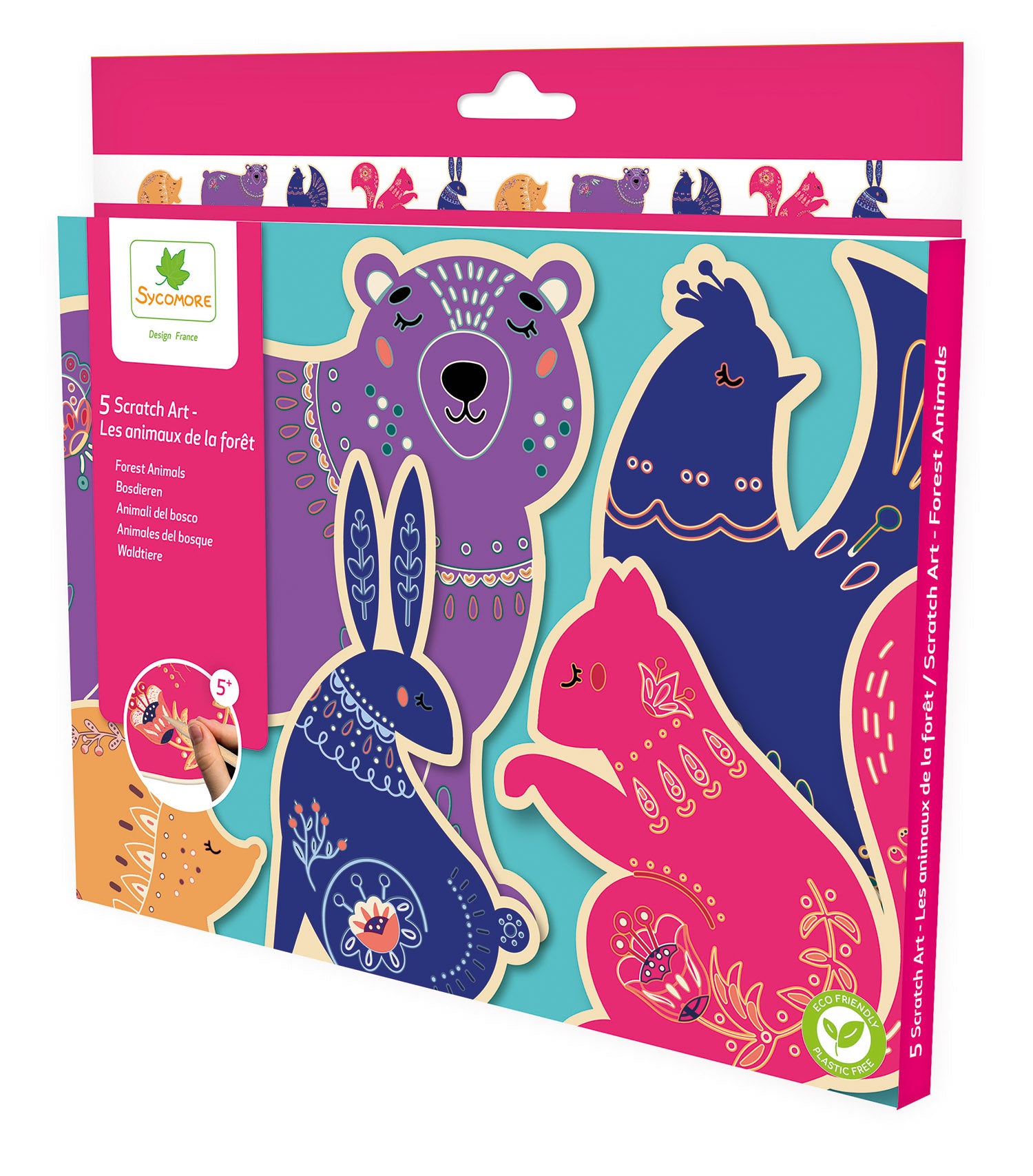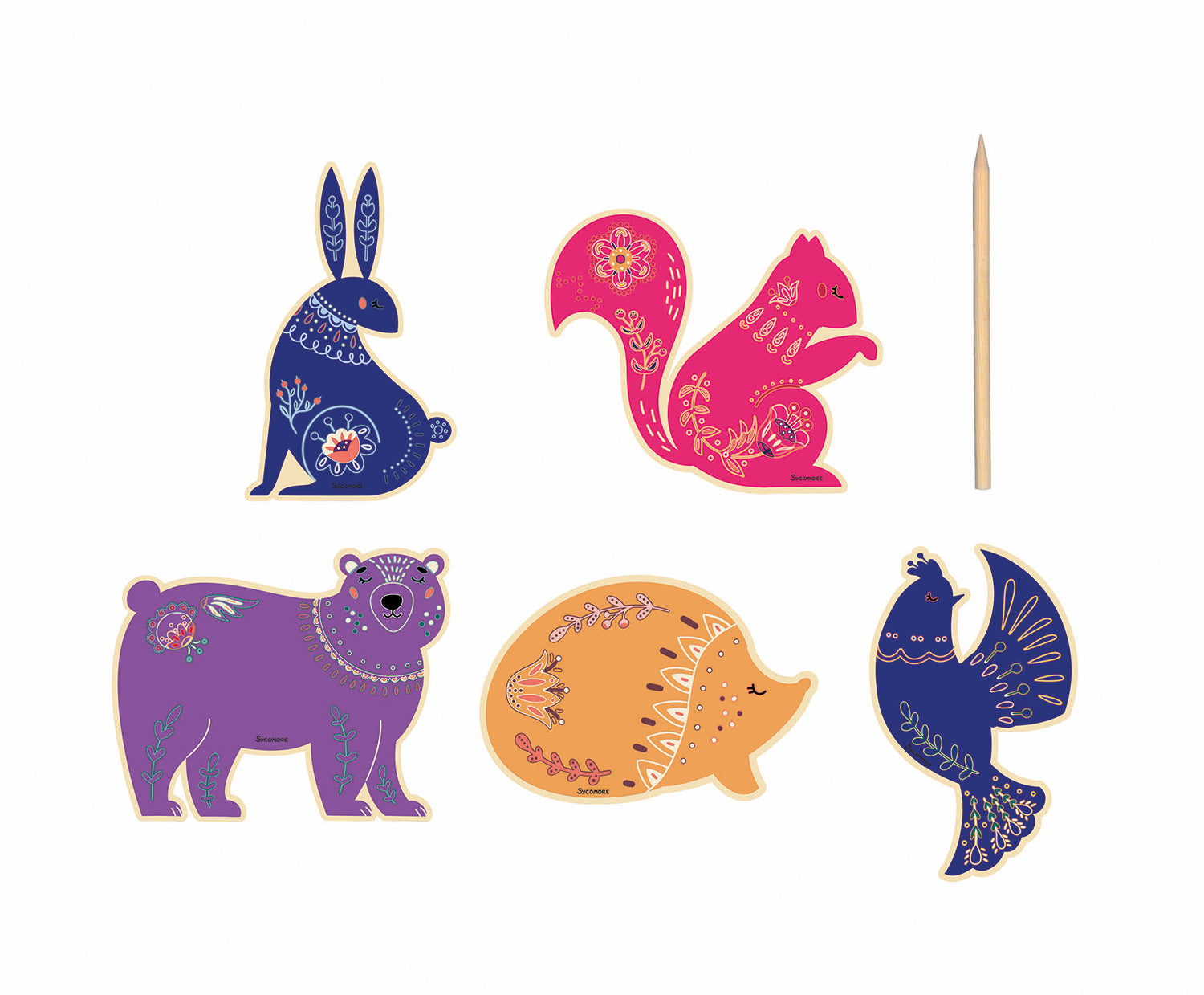 Dit pakketje bestaat uit 5 verschillende bosdieren waar je mooie vormen op kunt krassen en een kras potlood.