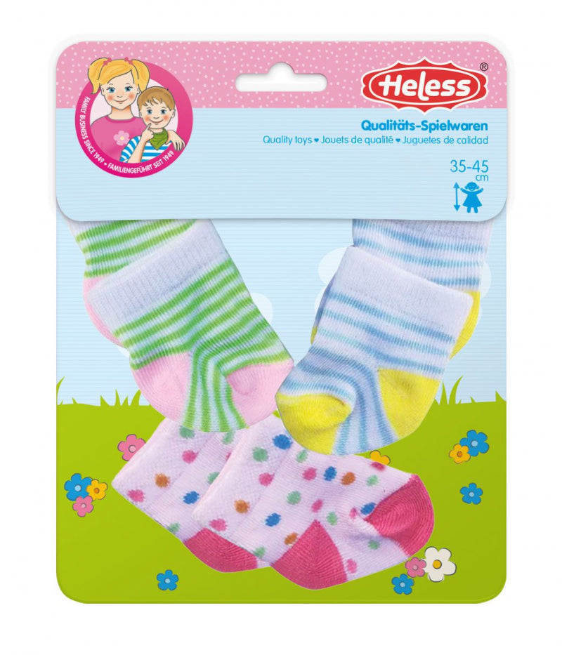 Deze kleurrijke set sokken van Heless laat poppenvoetjes er bijzonder schattig uitzien en houdt ze tegelijkertijd lekker warm. Of het nu gaat om kleuraccenten, blauw-witte strepen of groen-witte strepen: elk poppensokje in deze set kan met veel poppenoutfits worden gecombineerd.