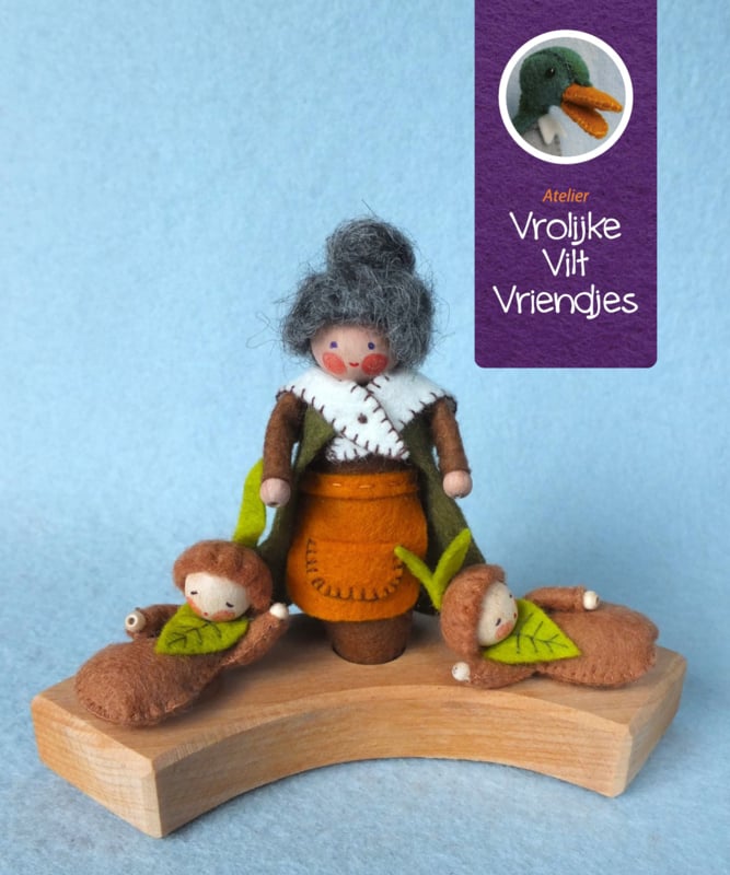 Moeder aarde en twee wortelkinderen. Drie stekers voor in de jaarring.