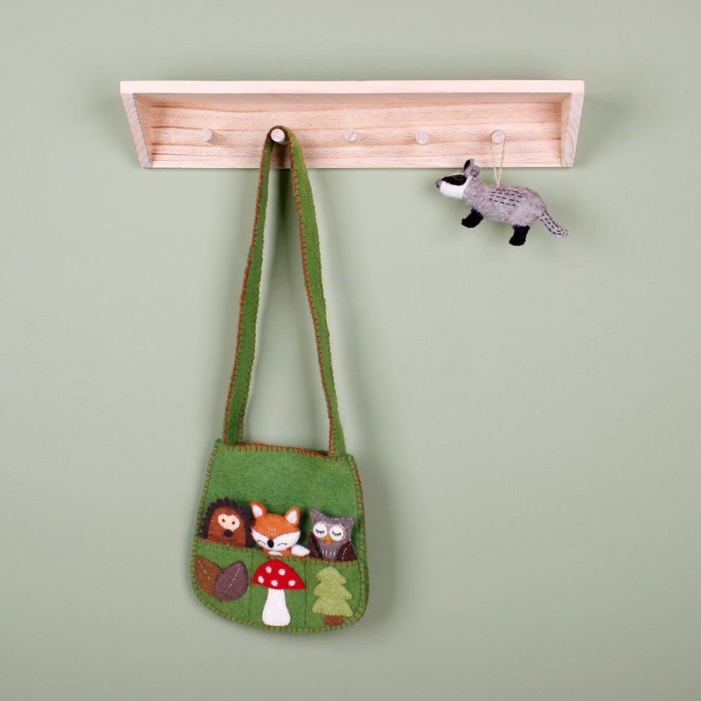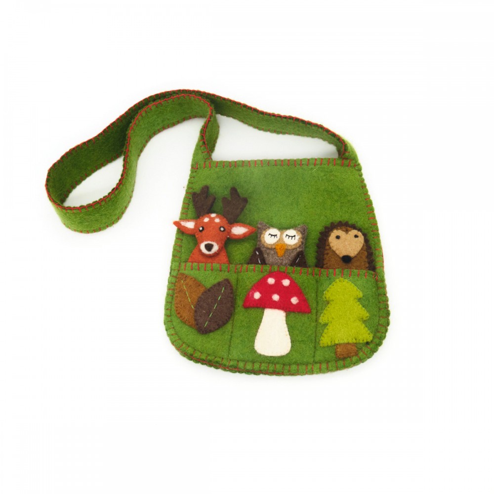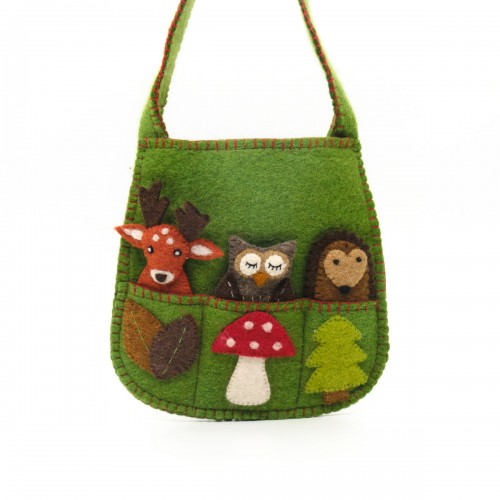 Tasje met daarin 3 vingerpopjes van bosdieren: een egeltje, een uiltje en een hertje. Op het tasje zijn blaadjes, een paddenstoel en een boompje van vilt genaaid. Het tasje is voorzien van een hengsel en drukknoop.