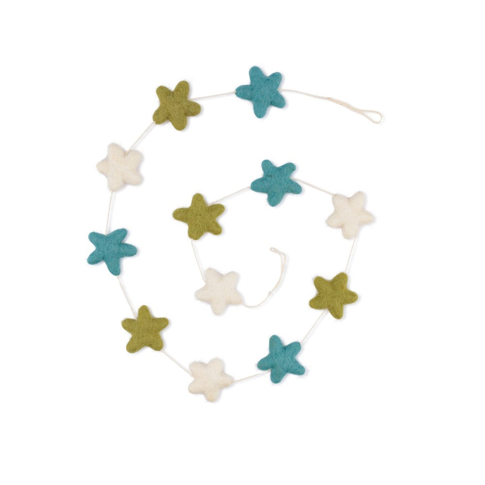 Viltslinger met sterren in winterse tinten groen, blauw en wit. De speelse sterrenvorm zorgt voor een vrolijke en sfeervolle uitstraling. Perfect om je kerstboom, schouw of muur een feestelijk accent te geven.