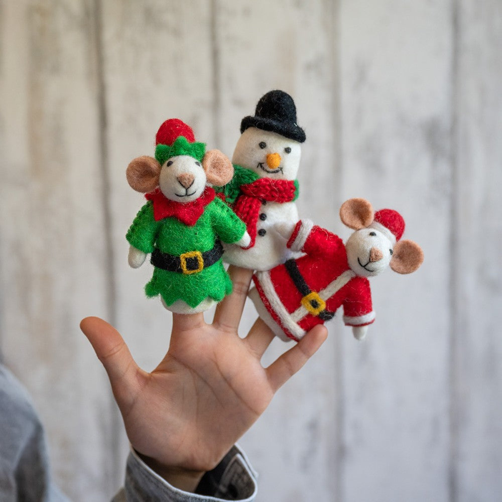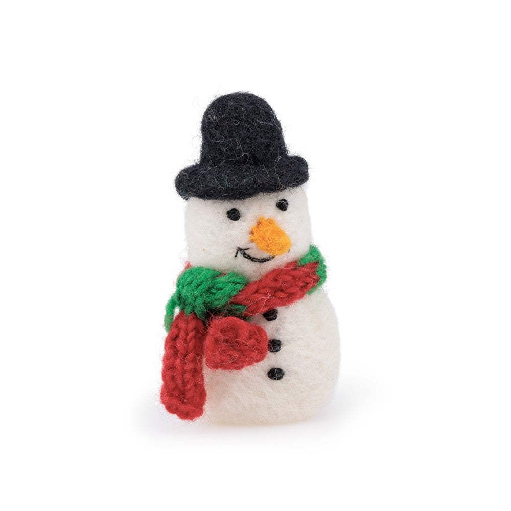 Vingerpopje sneeuwpop met zwarte hoed en rood-groene sjaal, een vrolijk wintervriendje voor spel of decoratie. Zijn glimlach en wortelneus brengen direct kerstsfeer. Leuk op tafel, in een schoen of als poppenkastfiguur.