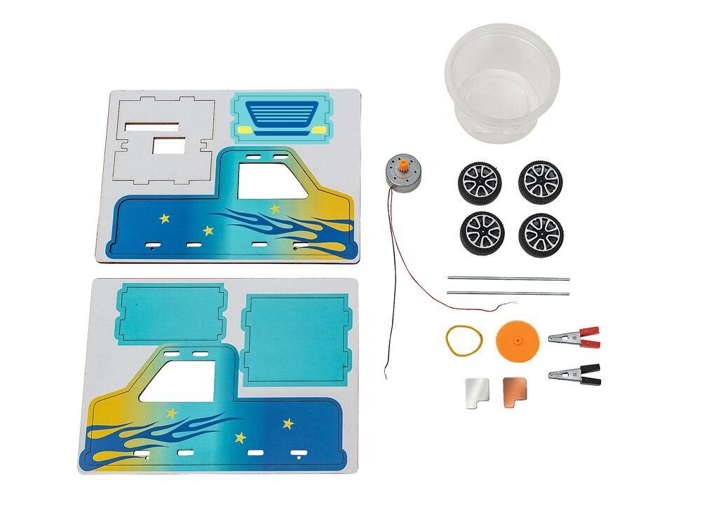 Bouwpakket voor megasterke zoutwater auto. Met het pakket creëer je heel eenvoudig en zonder lijm een elektrische auto die rijdt met behulp van zout water. Inclusief instructieboekje met spannende informatie over het wetenschappelijke fenomeen kinetische energie.